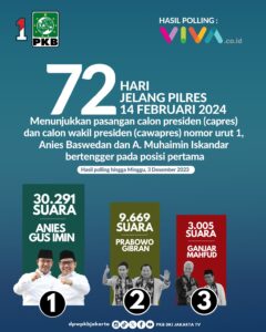 PKBTalk24 | Jakarta ~ Hingga 72 hari jelang Pilres 2024 pada 14 Februari 2024, pasangan capres-cawapres nomor urut 1, Anies Baswedan – Muhaimin Iskandar atau AMIN, paling banyak dipilih dalam poling yang digelar oleh VIVA.co.id