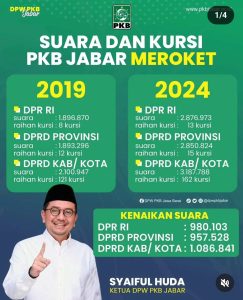 Sebagaimana hasil keputusan KPU di tingkat Provinsi Jawa Barat, suara PKB di Jabar meroket sangat signifikan, Kursi DPR RI dari 8 Naik menjadi 13, Kursi DPRD Provinsi dari 12 Naik menjadi 15, bahkan Kursi DPRD Kabupaten/Kota dari 121 naik menjadi 162.