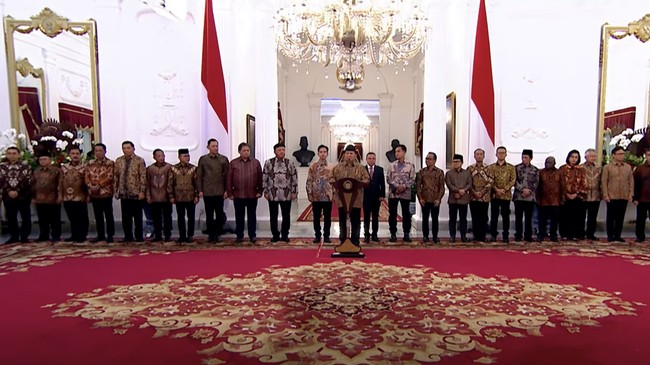Pengumuman kabinet pemerintahan Prabowo-Gibran dilakukan di Istana Kepresidenan Jakarta, Minggu (20/10/2024) malam. Prabowo didampingi Wakil Presiden Gibran Rakabuming Raka. Para anggota kabinet juga hadir di Istana.