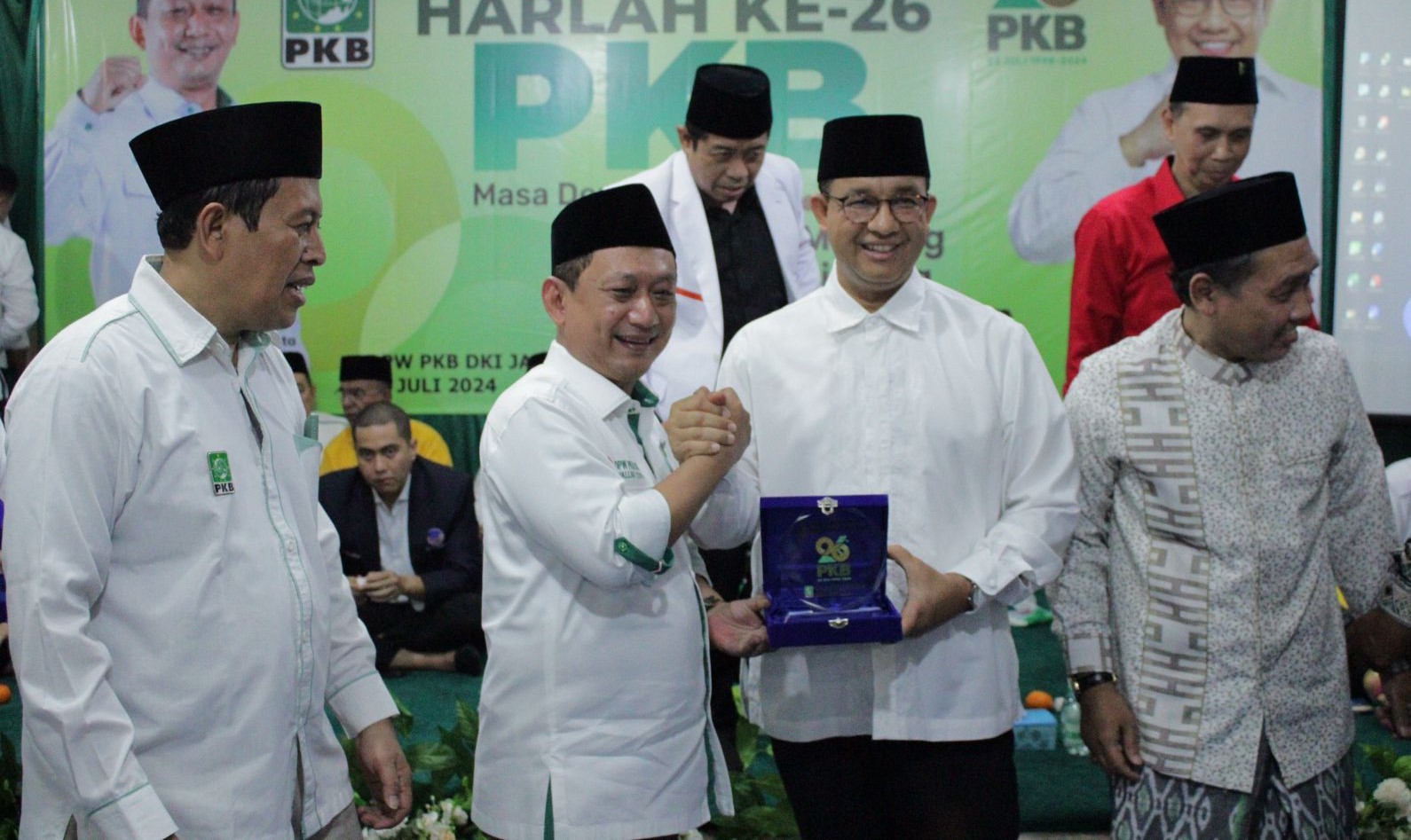 Hasbiallah Ilyas dan Anies Baswedan di dampingi Sekwil PKB Jakarta, Moh. Fauzi (kiri), dan Ketua PWNU Jakarta, KH. Samsul Ma'arif (kanan) dalam tasyakuran Hari Kelahiran (Harlah) ke-26 (PKB) di Kantor DPW PKB DKI Jakarta, Pulo Gadung, Jakarta Timur, Minggu (21/7/2024)