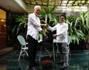 Ganjar Pranowo dan Cak Imin, keduanya kompak mengenakan kemeja berwarna putih, Ganjar dan Cak Imin tampak minum teh bareng di teras kafe. Keduanya bahkan sempat bersulang sebelum menyeruputnya secara bersamaan.