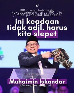 “Ke depan, kecurangan pembuat aturan yang bertindak sekaligus sebagai pemain bisnis kita slepet! Kita hadirkan perubahan berupa kesetaraan bagi semua pelaku usaha untuk bisa maju!,” lanjut Cak Imin.