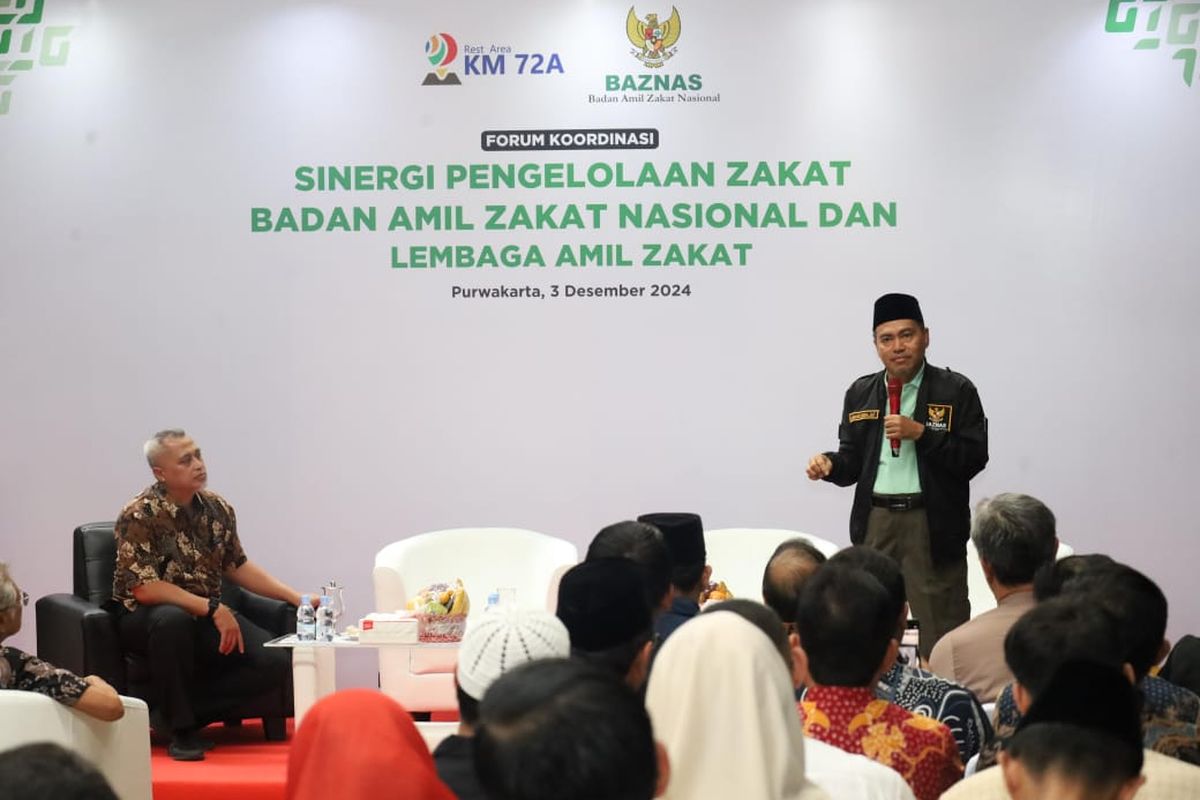 Pimpinan Baznas RI Bidang Koordinasi Nasional Kiai Haji Achmad Sudrajat dalam forum koordinasi bertajuk Ngobrol Filantropi di Rest Area KM 72 A Tol Cipularang, Kota Bandung, Jawa Barat (Jabar), Selasa, (3/12/2024).